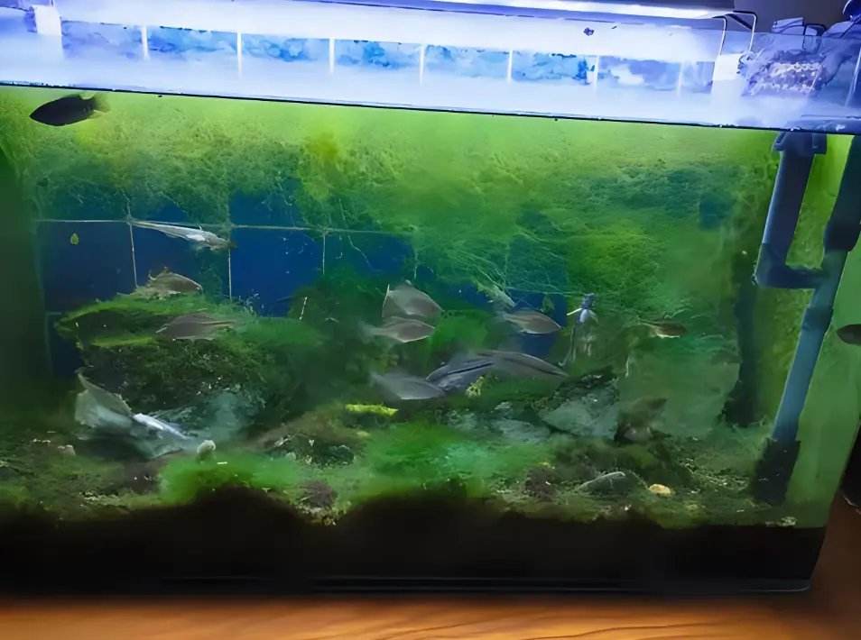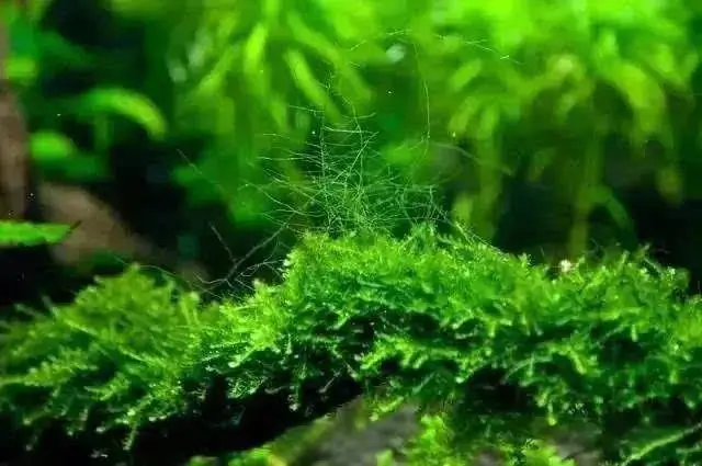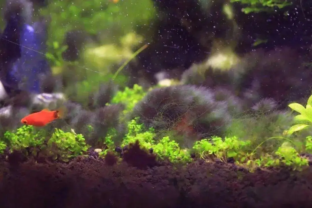 Hair algae form thin, floating green filaments that can cover the water surface. While a single strand is almost invisible, large patches are quite noticeable and can make the tank look messy. Although they are not highly harmful, they greatly reduce the tank’s aesthetic appeal.
