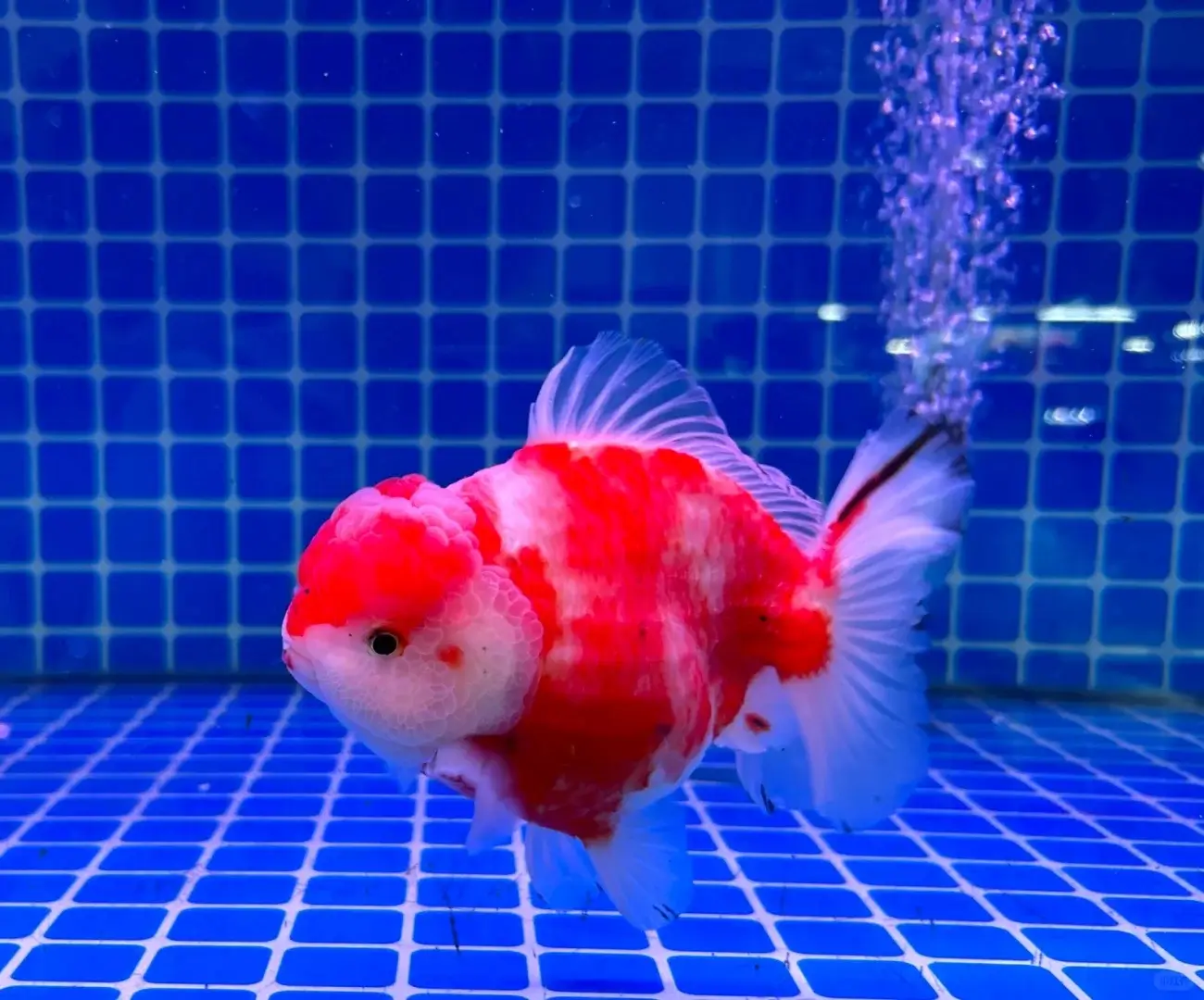 The most remarkable feature of the Sugarloaf Goldfish is its unique body shape. The body is short and round, with a prominently raised back, resembling ancient Chinese gold ingots, which is how it got its name. The length of an adult Sugarloaf Goldfish is generally between 8 – 15 centimeters. The growths on its head are well – developed. However, compared with the Thai Lionhead Goldfish, the growths of the Sugarloaf Goldfish are usually more compact and round, without the exaggerated extension to the cheeks like those of the Thai Lionhead Goldfish. Its tail fins are wide, mostly four – lobed, and when spread out, they are relatively flat. When swimming, they sway like a skirt, adding a touch of elegance. In terms of body color, the Sugarloaf Goldfish is quite diverse, with common colors including red, white, red – and – white, and multicolored. The scales shine with a soft luster under the light.